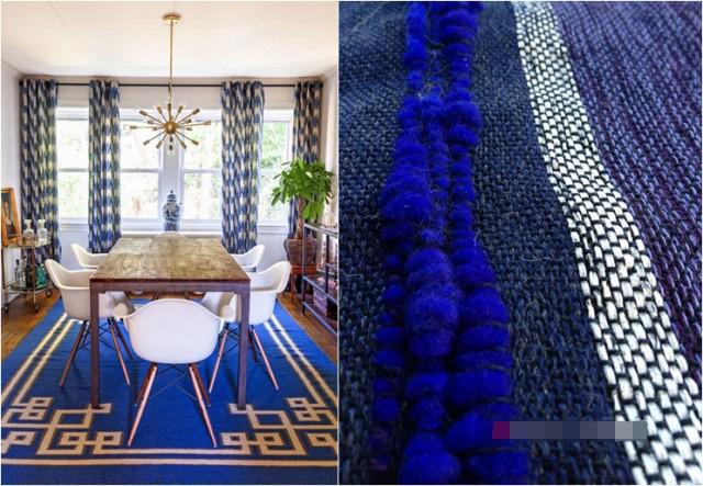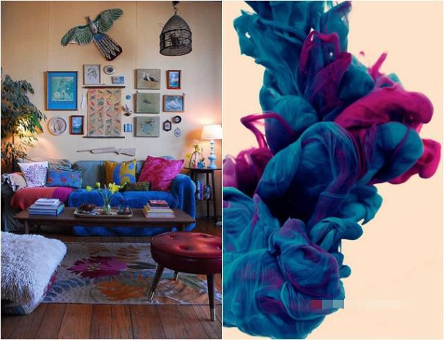 藍(lán)色與枚紅色、黃色搭配讓空間充滿時尚、青春活力,配以深藍(lán)色和白色讓空間沉穩(wěn)安靜下來,比例很重要。