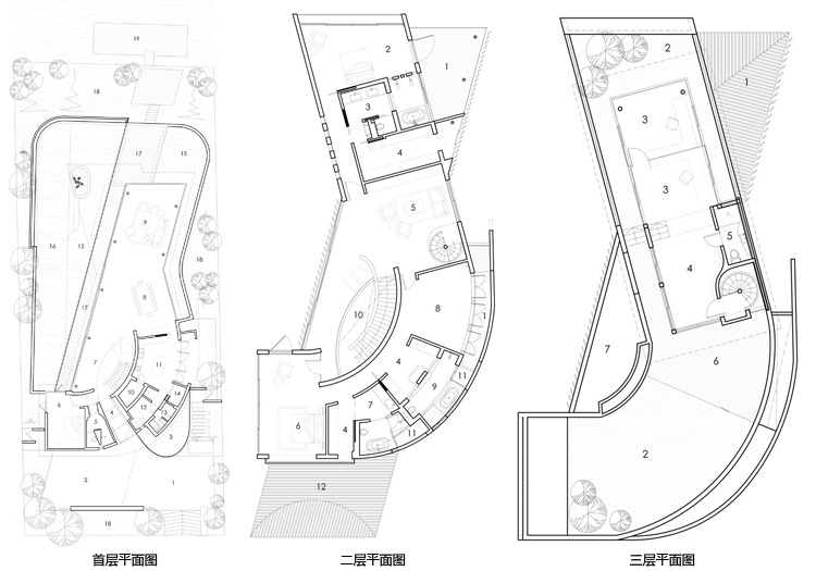 別墅設計,13 Cove Grove別墅(13 Cove Grove)13 Cove Grove別墅建在一處狹長的基地上,正對著一小片水域。為了使居住者最大化地欣賞到水域的風景,設計團隊將別墅裝修設計成一個類似回力鏢的體量,從而使臥室正面像這片美景。這樣的布局安排,使這個游泳池的一邊一直延伸至一層的一側。另外,團隊還在一層的主要區域設計了一個連續性的空間,進入這里后,人們可以看到筆直的水域獲得更加連續的視野。與水域相連的是一個線性的木質甲板設計,一直從房間內部延伸出來,視覺上增加了房屋的面積。除了基本的回力鏢設計,團隊至少還采用了另外兩種布局的變體,從立面設計看,設計師以完全不同的方式設計了不同兩側的回力鏢體量。面向街角的一層,將透明與封閉設計交叉使用,而二層則完全使用了實體墻進行立面設計。靠向水域的一層則采用了相對開放的透明玻璃設計,增強了可視度。一層主要作為公共活動空間,二層為臥室區域,而與屋頂花園相連接的三層則主要作為工作室使用。