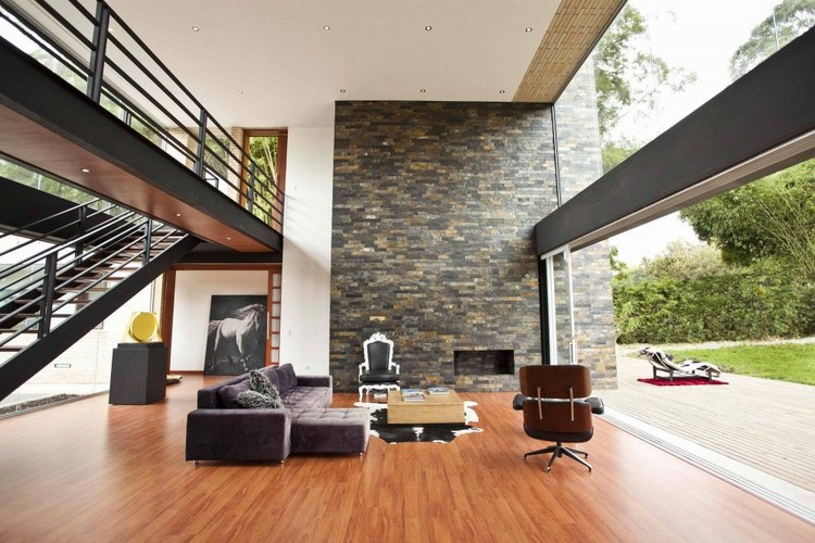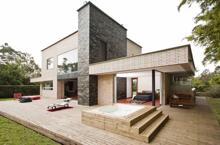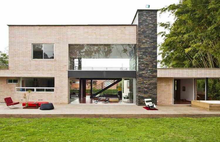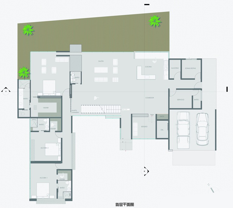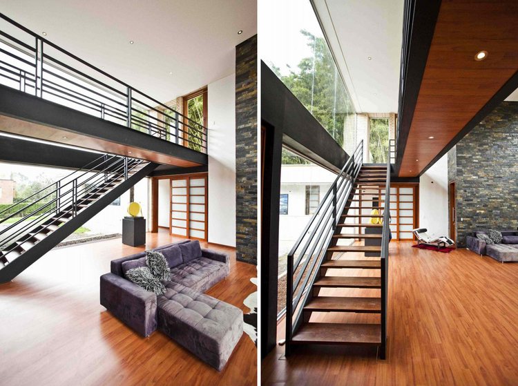 別墅設(shè)計,Olaya別墅(Olaya House)Olaya別墅位于哥倫比亞Medellin市中心大概45分鐘的車程,房屋的首層采用統(tǒng)一樣式的磚塊鋪筑而成,但各功能分區(qū)布局規(guī)整、明確,包括服務區(qū)、活動區(qū)和私人區(qū)。服務區(qū)域包括車庫、傭人房、洗衣房和貯藏室。活動區(qū)內(nèi)設(shè)有一個巨大的廚房并與用餐區(qū)和主客廳相對,通過一道甲板式通道便可來到院落。私人區(qū)有三個我是,每一個房間都帶有獨立衛(wèi)生間、浴室和更衣室。活動區(qū)與私人區(qū)被一道巨大的黑色磚墻所隔開,不論從室內(nèi)還是室外都可以看到這道墻,同時墻體也是房屋主結(jié)構(gòu)之一,墻體內(nèi)部設(shè)有一個公共于是和兩個獨立的煙囪,分別服務于主臥和主客廳的通風。經(jīng)過位于一層服務區(qū)的風格化樓梯便可以來到二層:這里簡單舒適,分為兩個寬敞的區(qū)域,一個是書房一個是主臥,另外還設(shè)有兩個巨大的露臺陽臺,可以從這里欣賞外面的風景。值得一提的是,露臺與房屋由一座小橋連接。