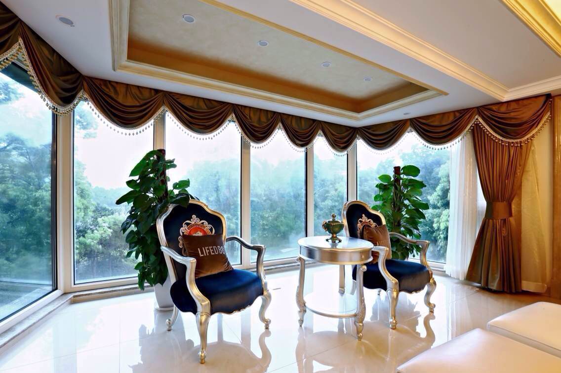 餐廳秉持典型的法式風格搭配原則,餐桌和餐椅均為米白色,表面略帶雕花,配合扶手和椅腿的弧形曲度,顯得優雅矜貴,而在白色的卷草紋窗簾、水晶吊燈、落地燈、瓶插百合花的搭配下,浪漫清新之感撲面而來.