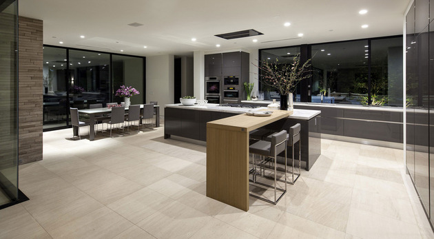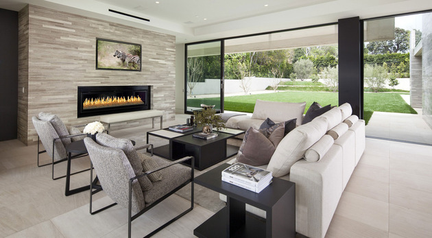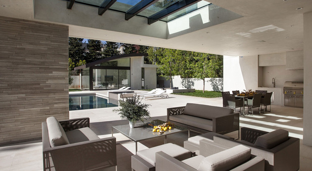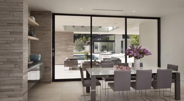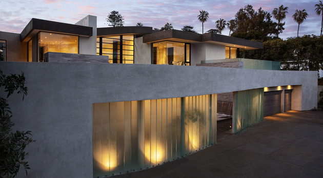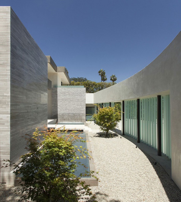 房子位于一條街道,為了減少汽車噪音影響,建筑師用高大的圍墻和大門將庭院與街道隔開,大門兩側(cè)是玻璃百葉,起到緩沖噪音的作用,同時(shí)不阻擋光線通過。此外,還設(shè)計(jì)了一條路和小橋,將大門和室內(nèi)連接。穿過院子時(shí),可以欣賞水景,也能聽到瀑布?jí)Φ牧魉暎谷烁械椒浅7潘伞?br />
